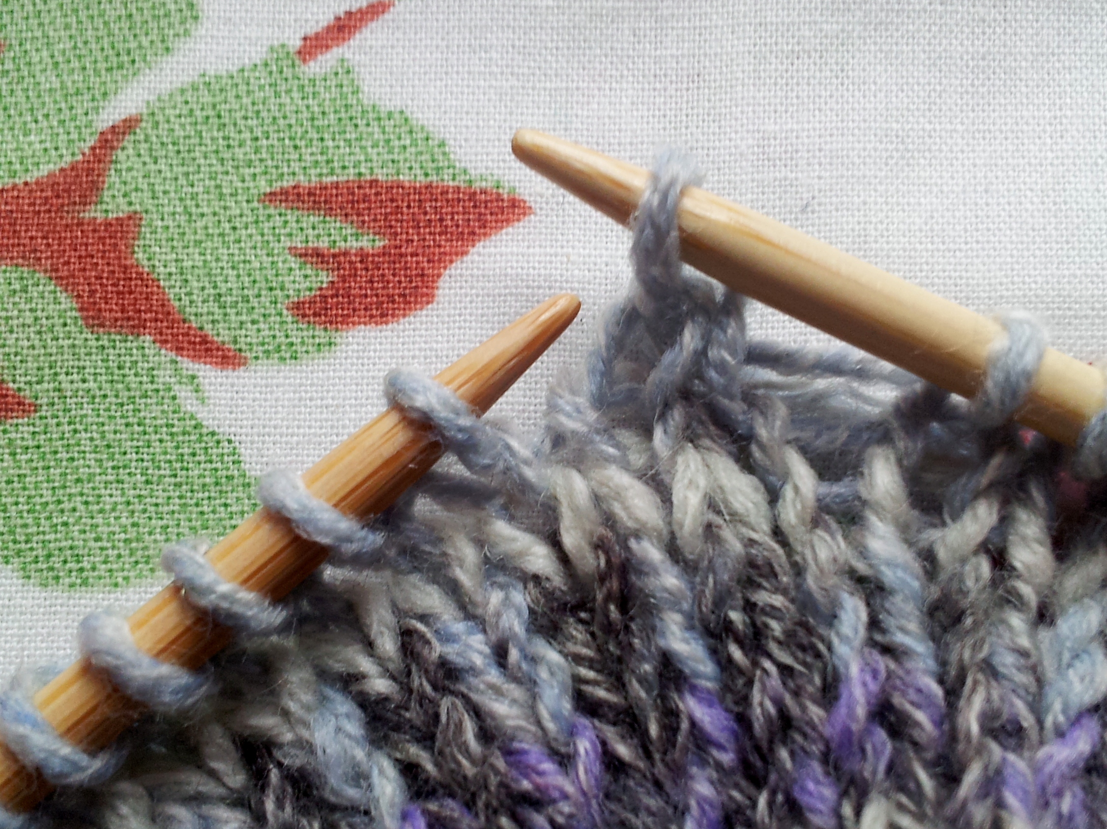 A simple way of decreasing the number of stitches is shown below. This method is also referred to as “knit two together” or K2tog for short.