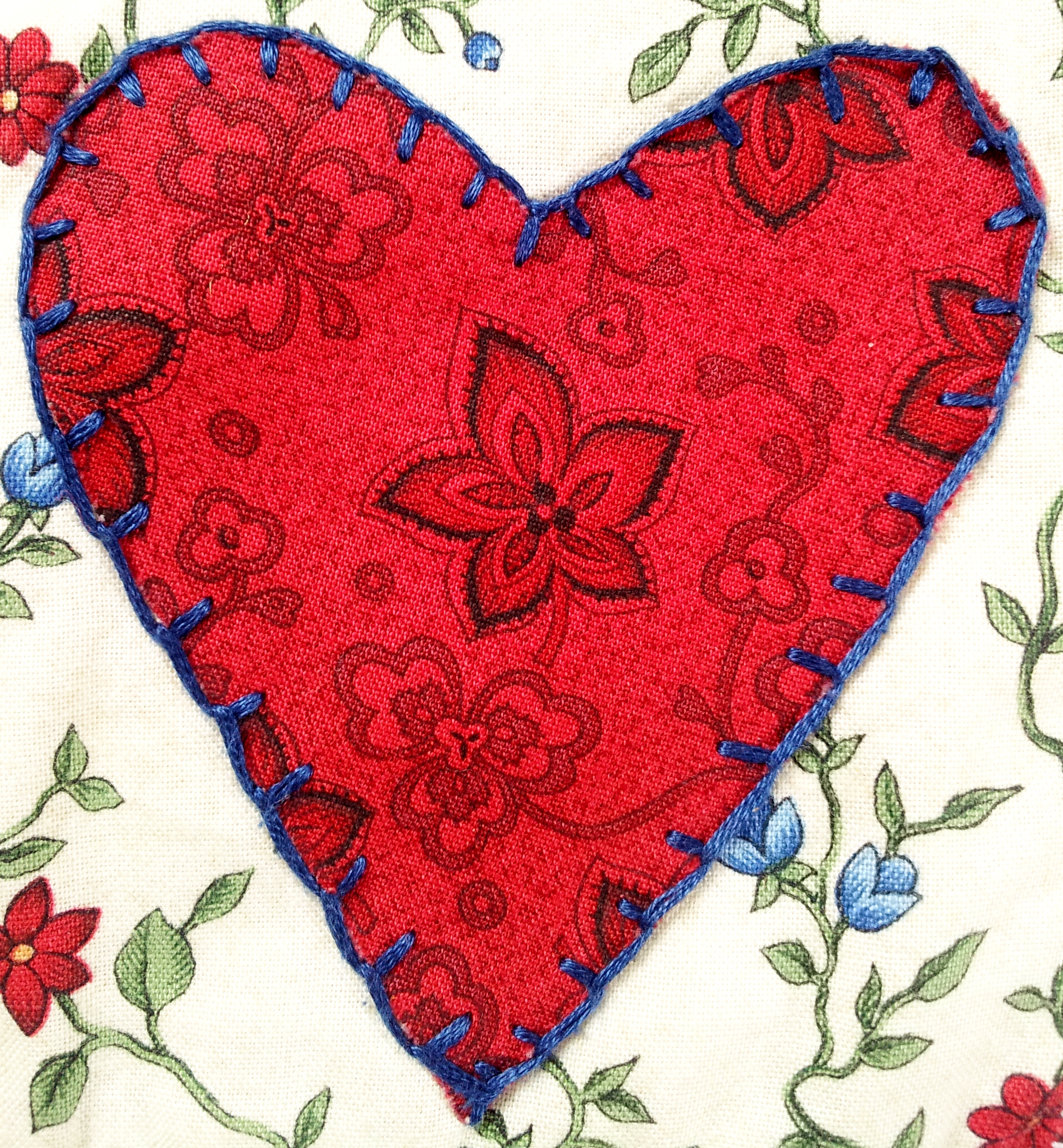 I first started work on the 4 applique heart squares, which were pretty simple and great fun to do. They are made by sticking a heart onto a square with fusible webbing and using blanket stitch for embellishment around the edge.