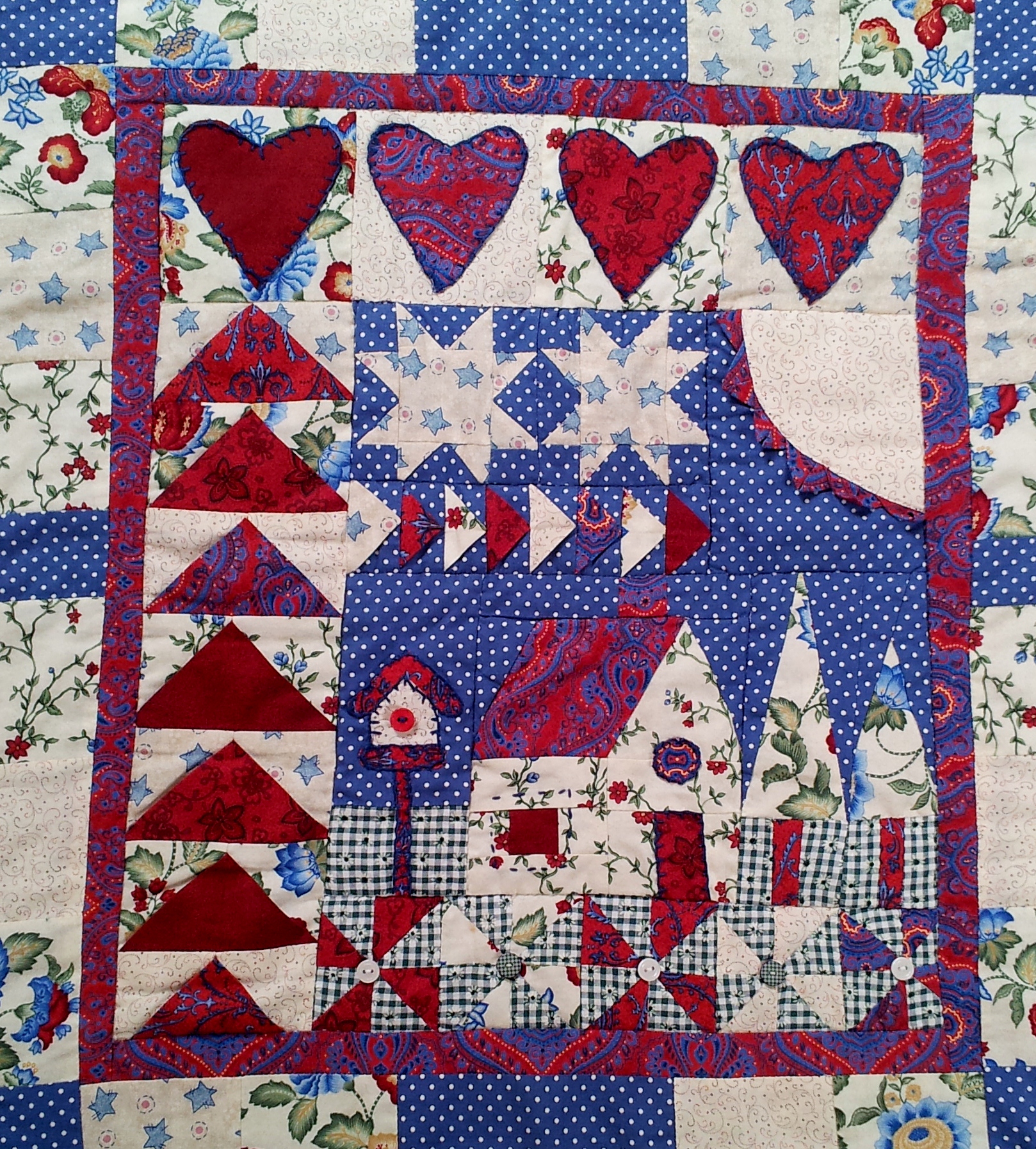 My favorite part of the quilt is the house in the middle of the main panel, along with its birdhouse and trees. The birdhouse is applique and the trees and house are made by ‘foundation piercing’.  This is when you join your fabric pieces by sewing them, wrong sides together, to a paper template. It’s a bit of a sew and flip technique!