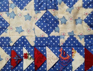 The next section I worked on were the stars and triangles – I think the triangles are referred to as “flying geese” in the world of quilting. Although the principle of making them is well explained, my points aren’t perfectly aligned as my cutting and measuring is out.