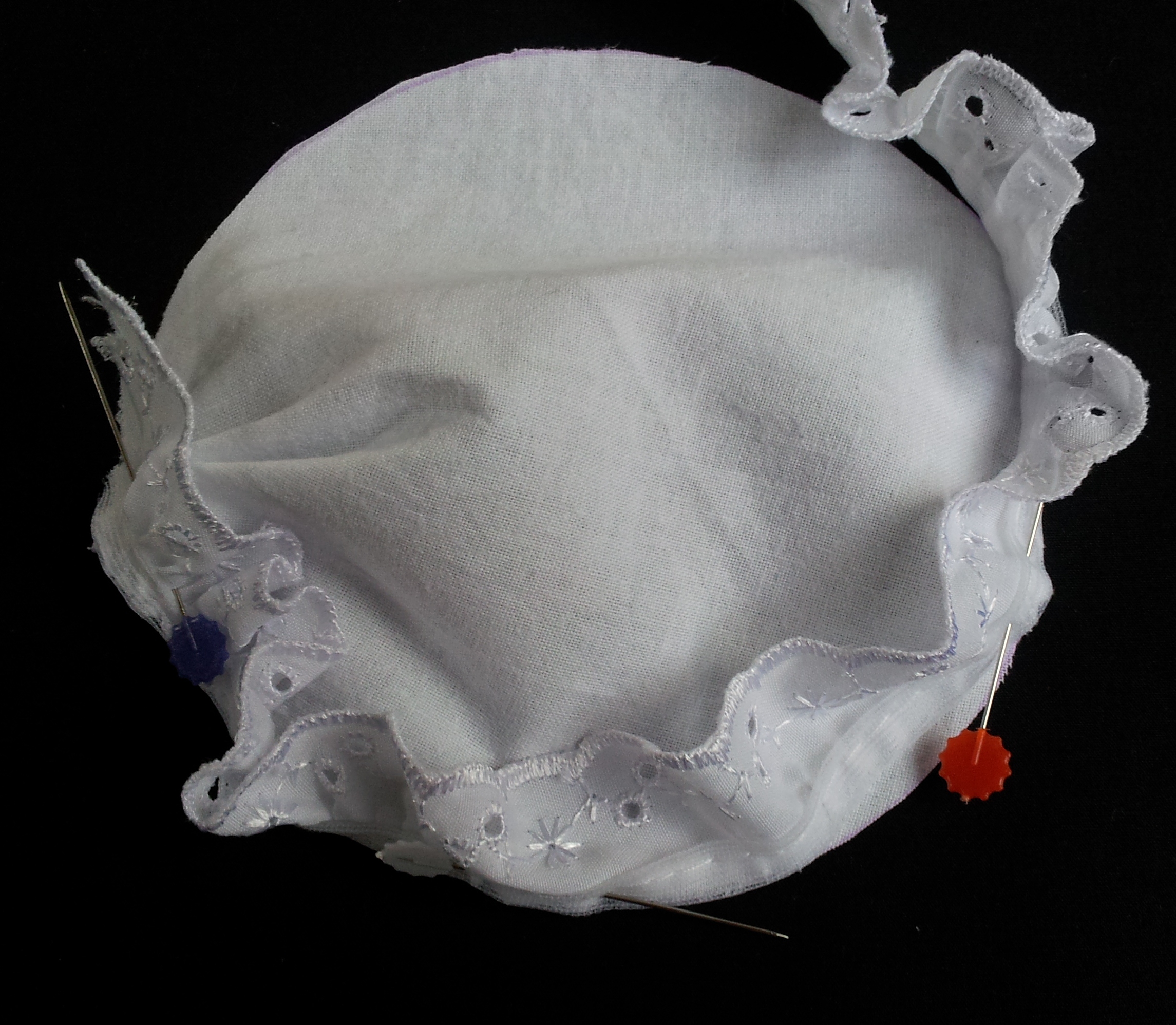 3. Add some lace to the edge of your cap – I used 1 inch ruffled scalloped (which was £1.20 a metre). Start the lace where your folds are so that the join will be hidden later by the bow. Lay the lace so the right sides are together and stitch around the outside edge.