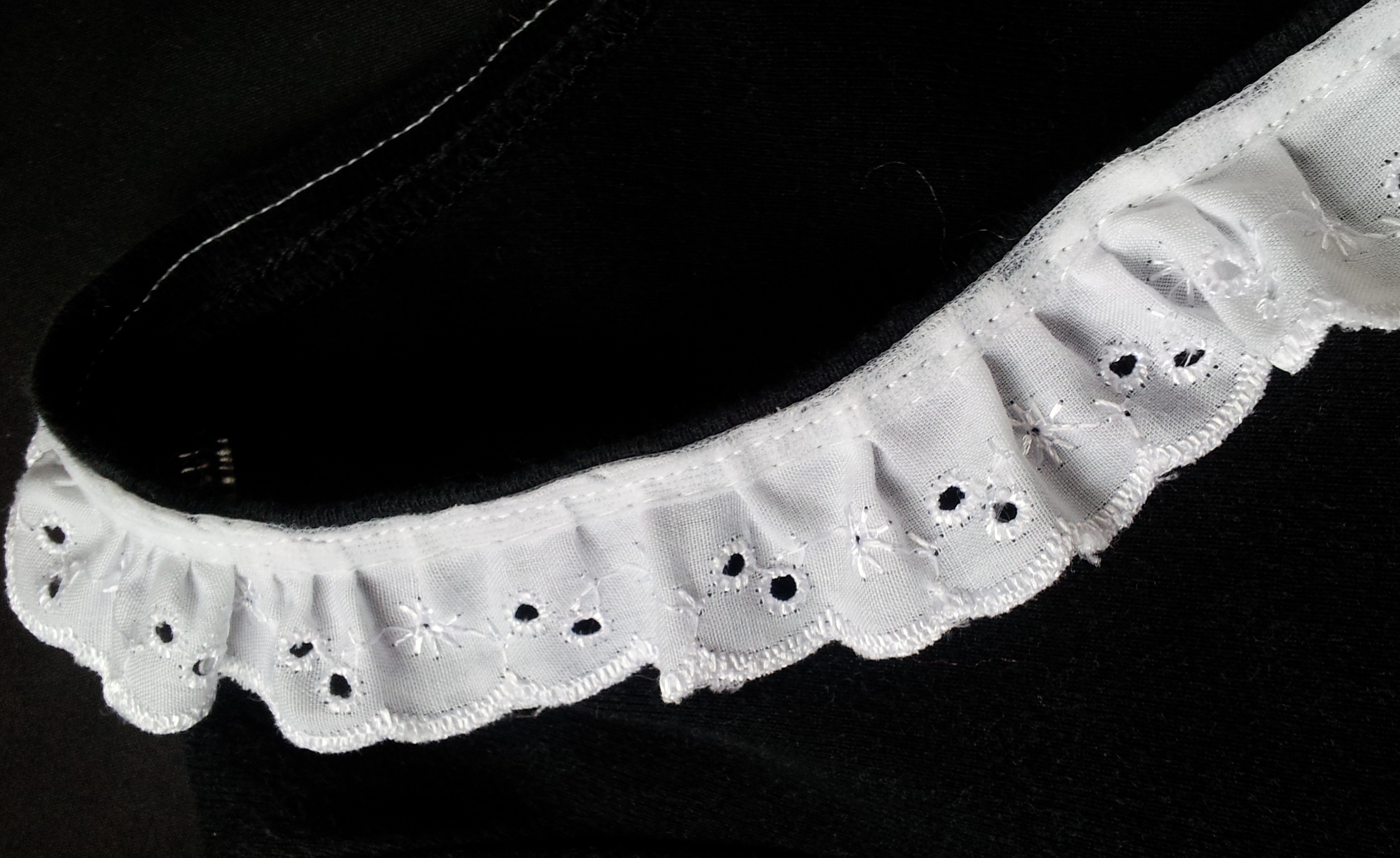 For the rest of the outfit, I found some fish-nets and black skirt in the cupboard which I wore as they were. For the top, I found an old long sleeve T-shirt and added a collar and cuffs. Which do you prefer? I couldn’t decide whether to go for the lace or old shirt collar and cuffs so ended up going for a bit of both!