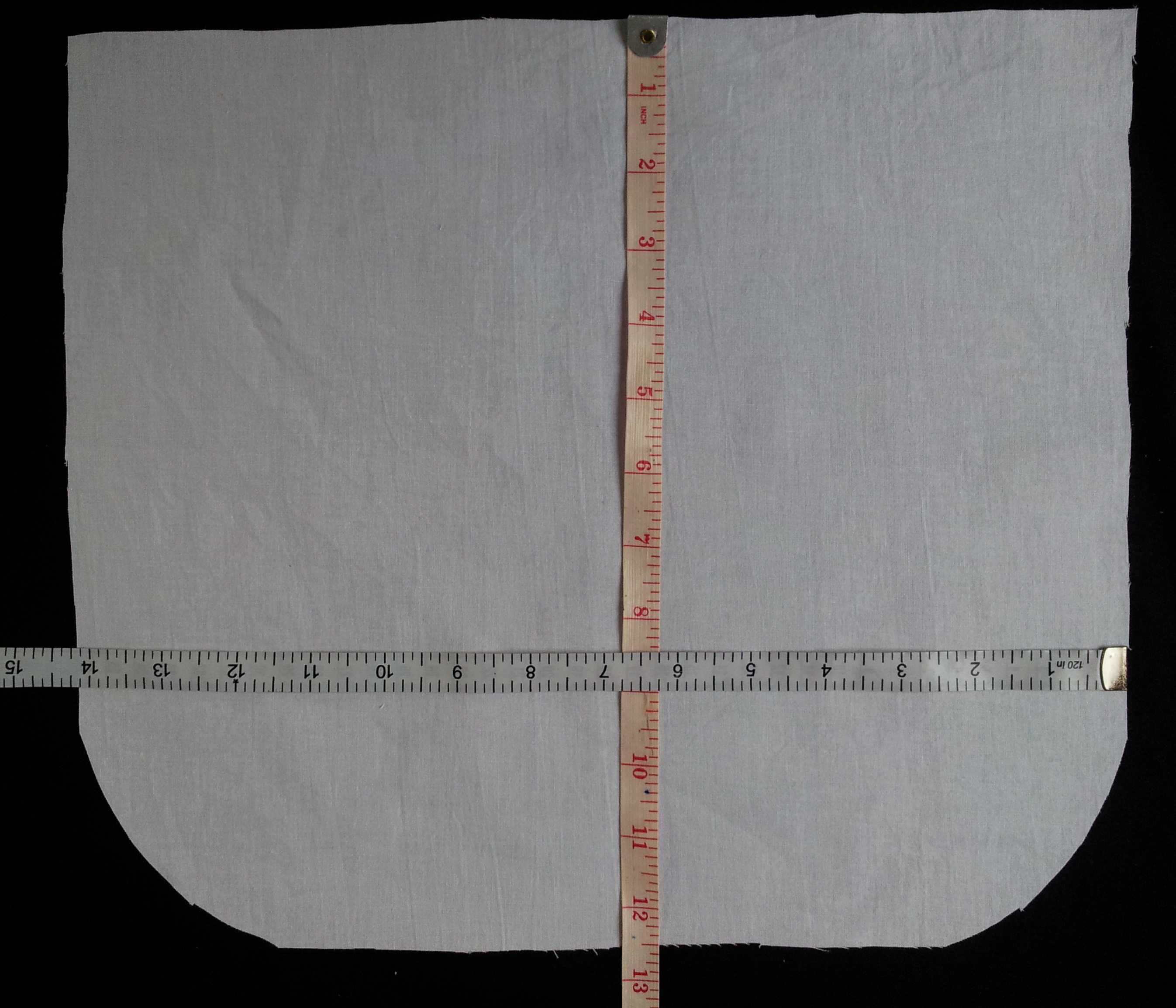 1. Cut a rectangle of white cotton 12.5 inches long x 14 inches wide. Fold in half and round off the bottom edges.