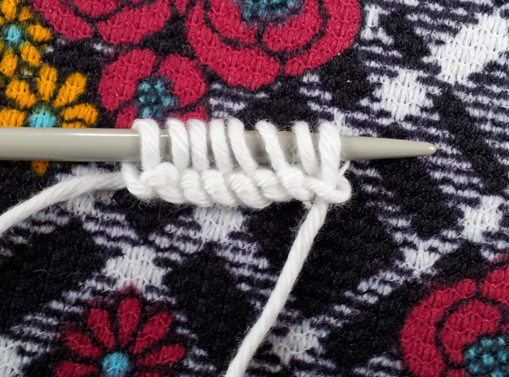 d) Knit 1 stitch from your left hand needle so that you have 2 on your right.