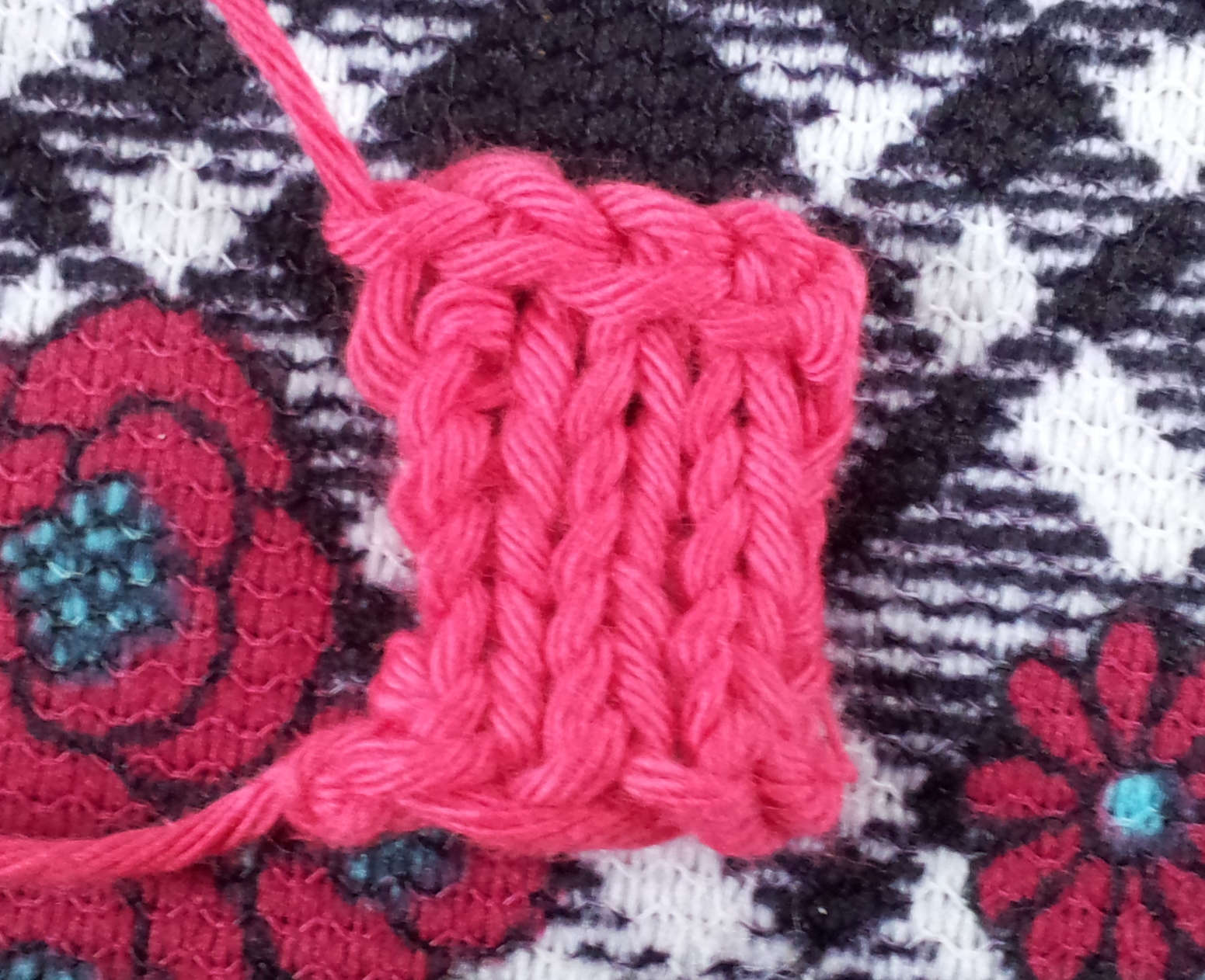 Row 6: Change your yarn to pale pink (ie, icing colour) and purl all stitches in the row. Your cake top should look something like this: