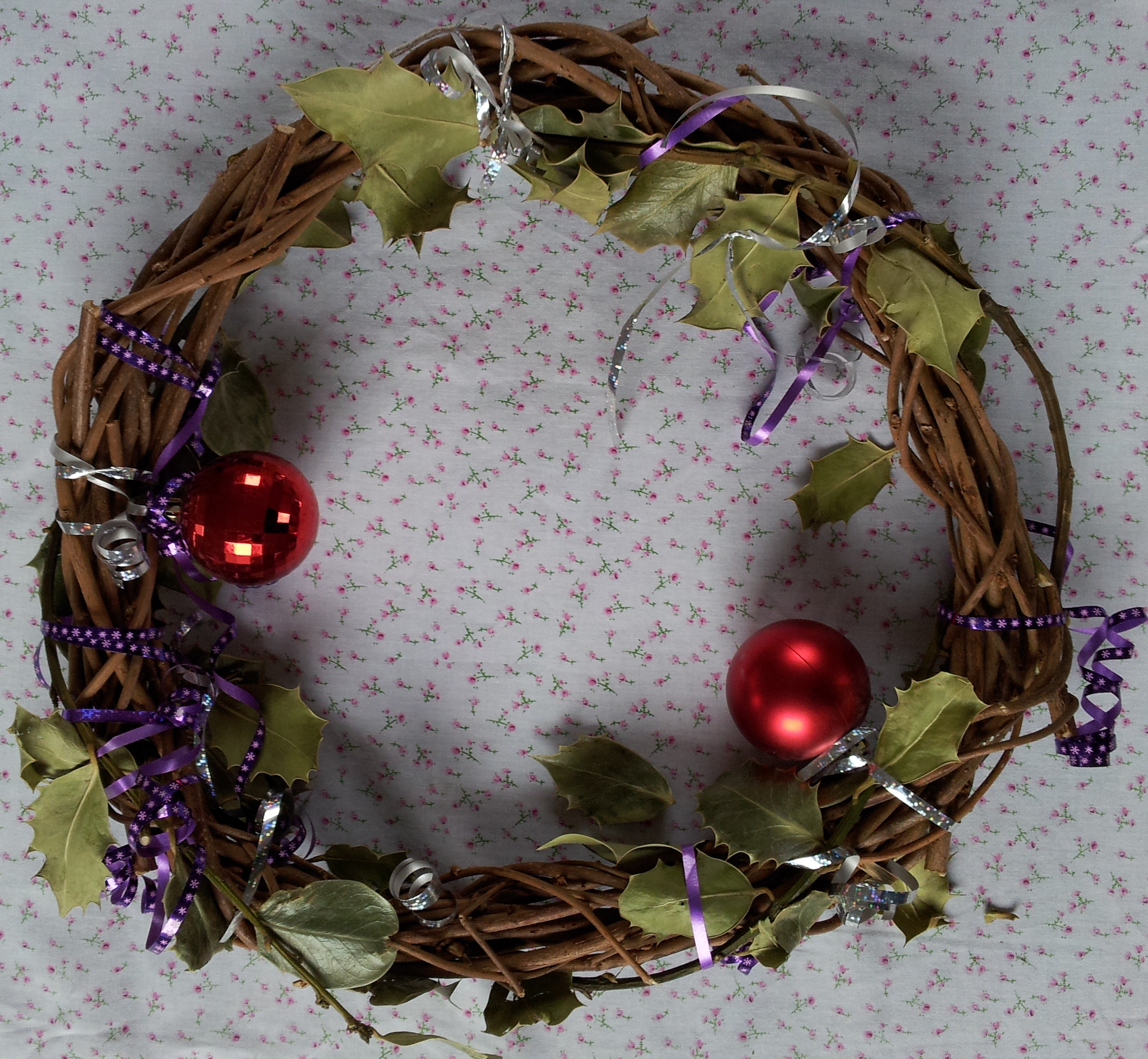 So here is my rather dried up Christmas Wreath, with and without its tired looking adornments! I made the wreath base from pieces of hazel in my back garden – hence its unique shape!