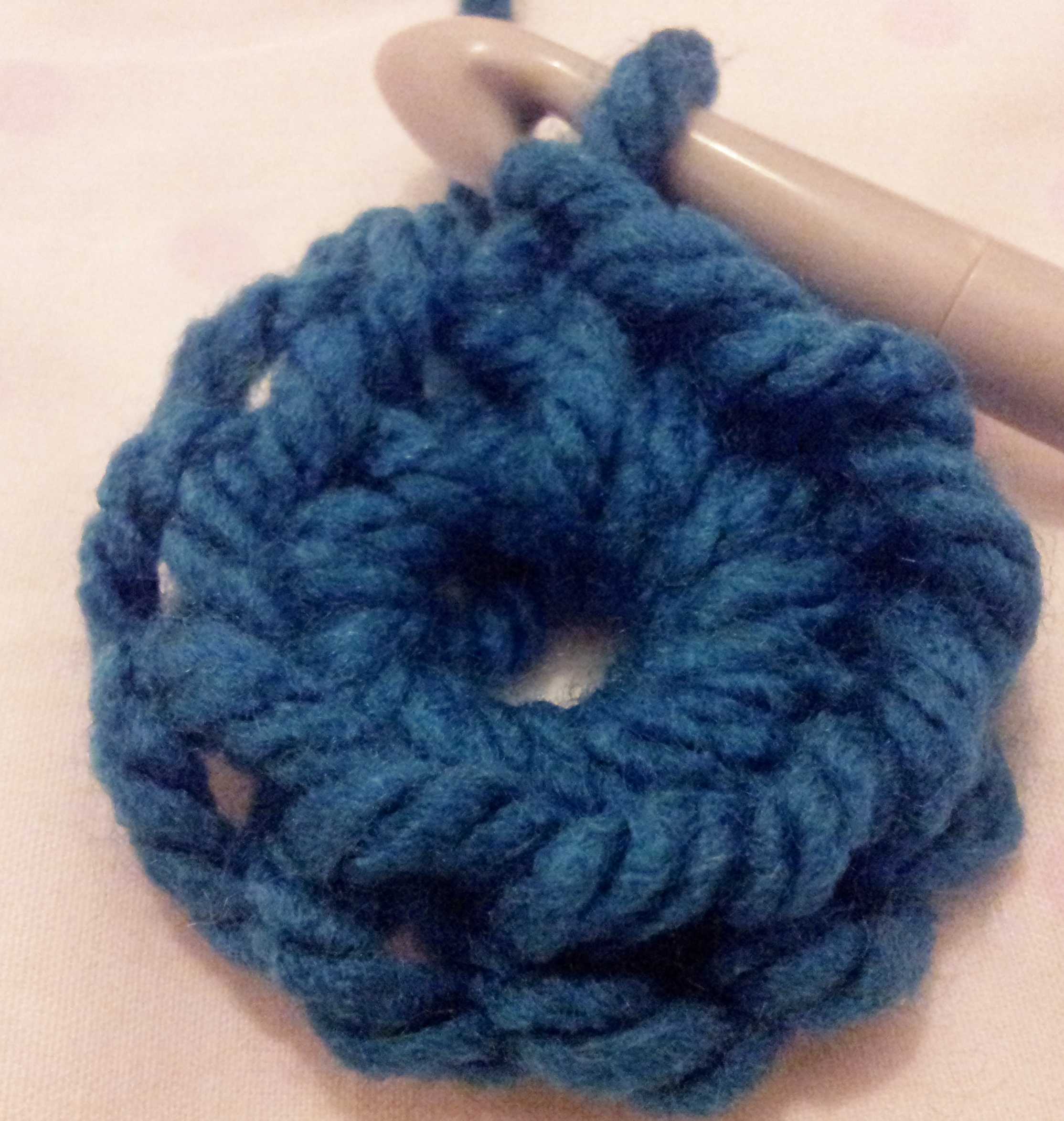 Round 2: Chain 6, skip 1 UK double (US single) stitch loop then slip stitch into your next UK double (US single) stitch loop to form a petal. Repeat 5 times until you have made 5 petals. Keep one yarn tail long so you can stitch the flower onto your headband.