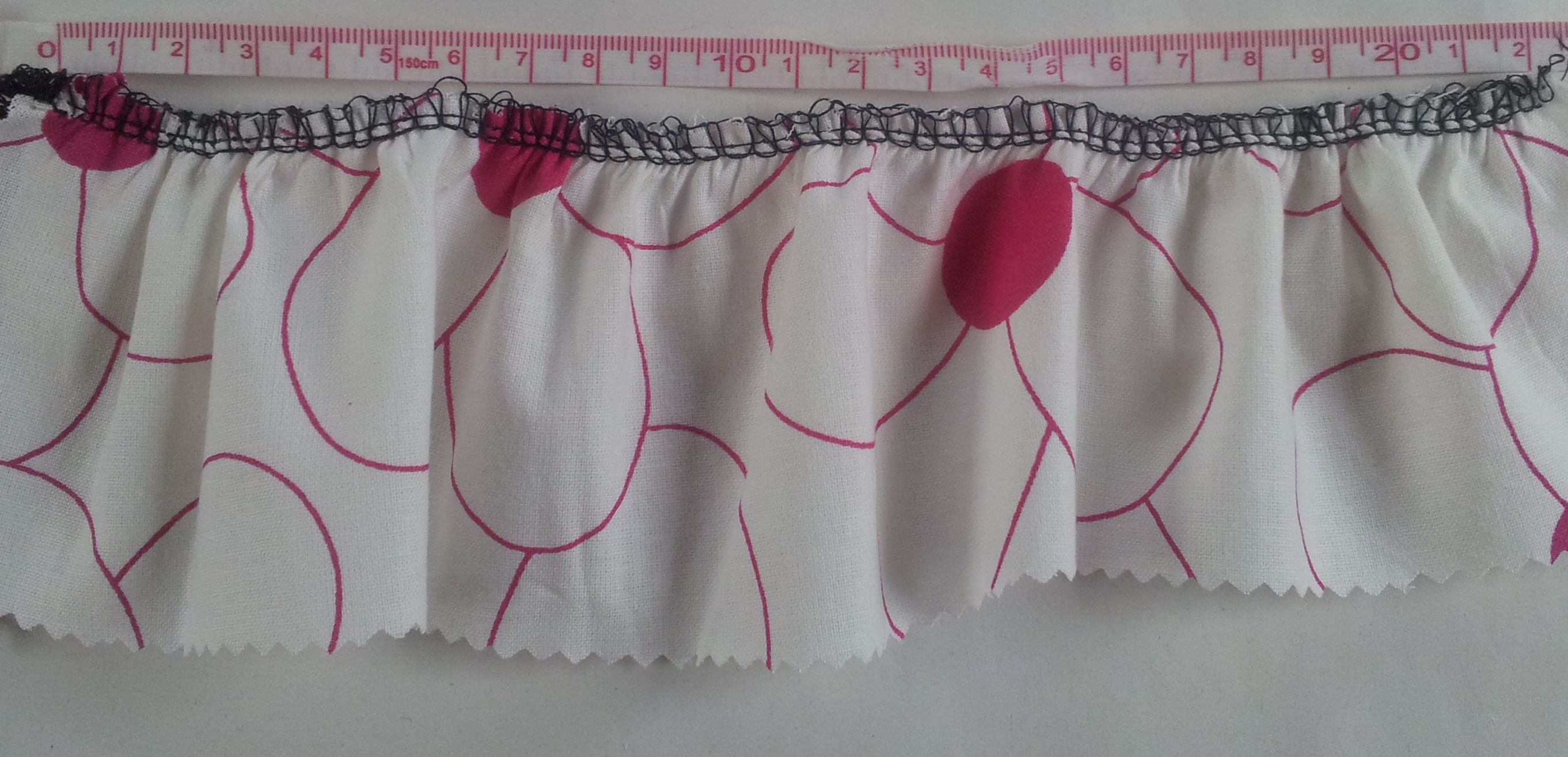 This feature really helps if you want to ruffle a fabric. With a differential feed setting of 2, a 40 cm long straight piece of fabric was easily gathered to give this fabulous effect.