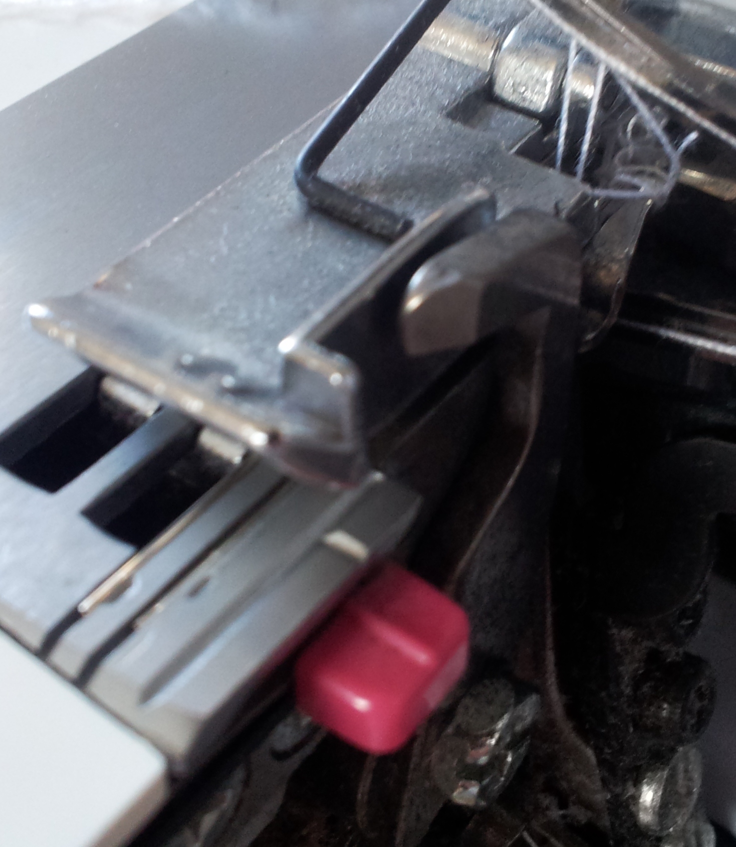 To take my chaining finger ‘out of use’, I pull the red tab you can see in the photo to the ‘R’ position. Can you see the chaining finger disappear under the throat plate? Clever!