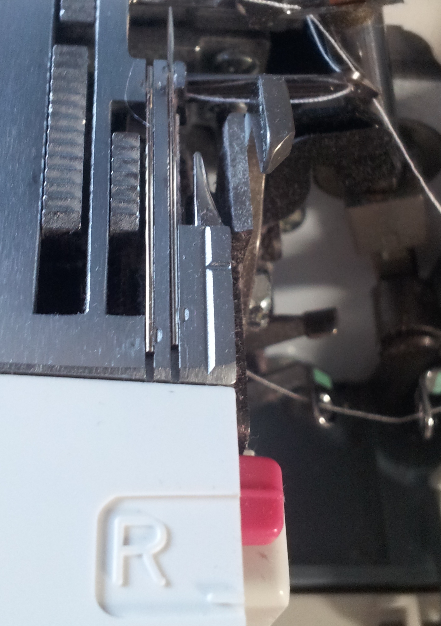 Stitch Cutting Width Adjuster: On the left hand side of my machine there is a dial which I turn to move the cutting blade either closer to, or further away from, the throat plate.