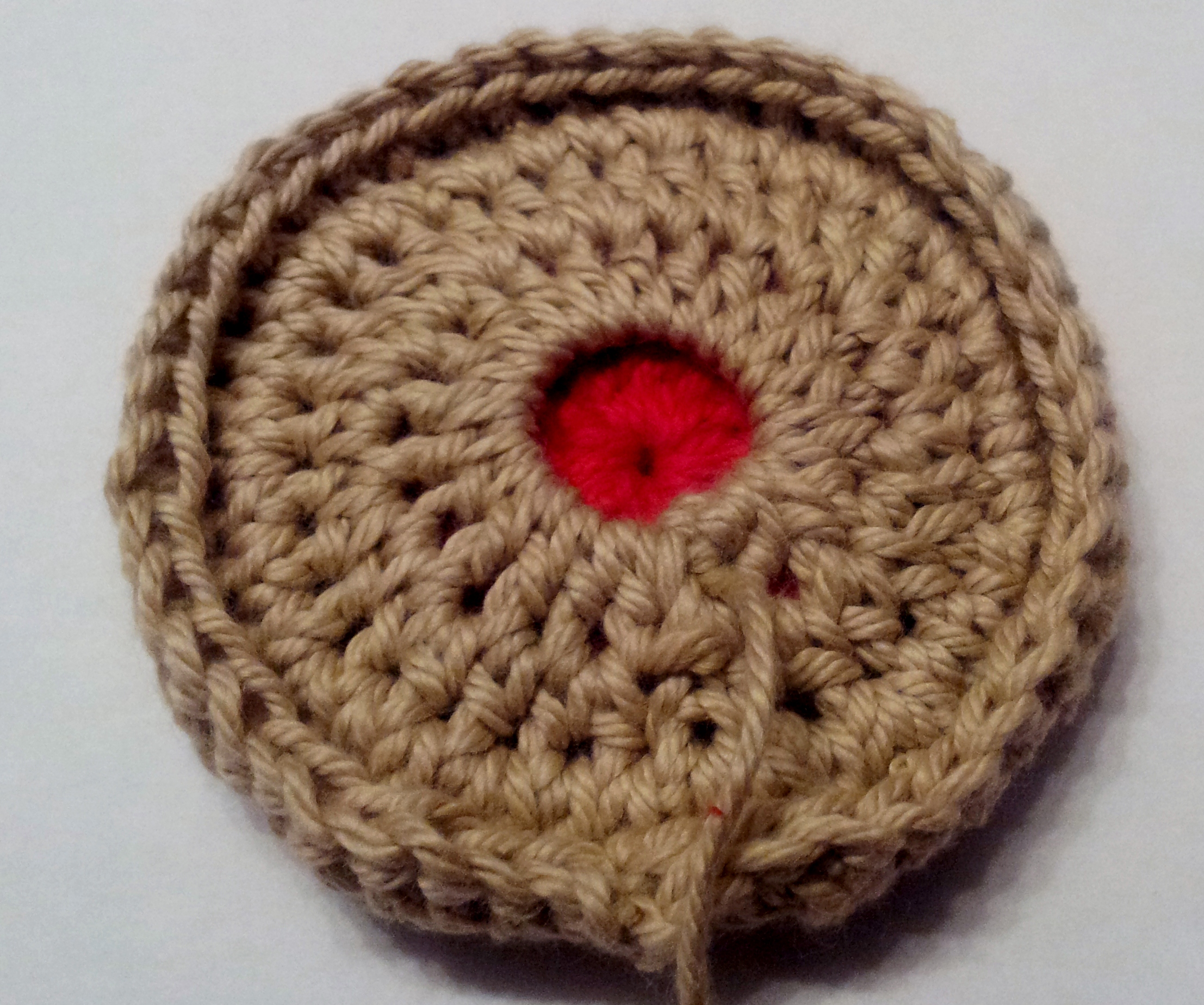 …after a few rounds, it was time to crochet the biscuit base and jammy filling together…