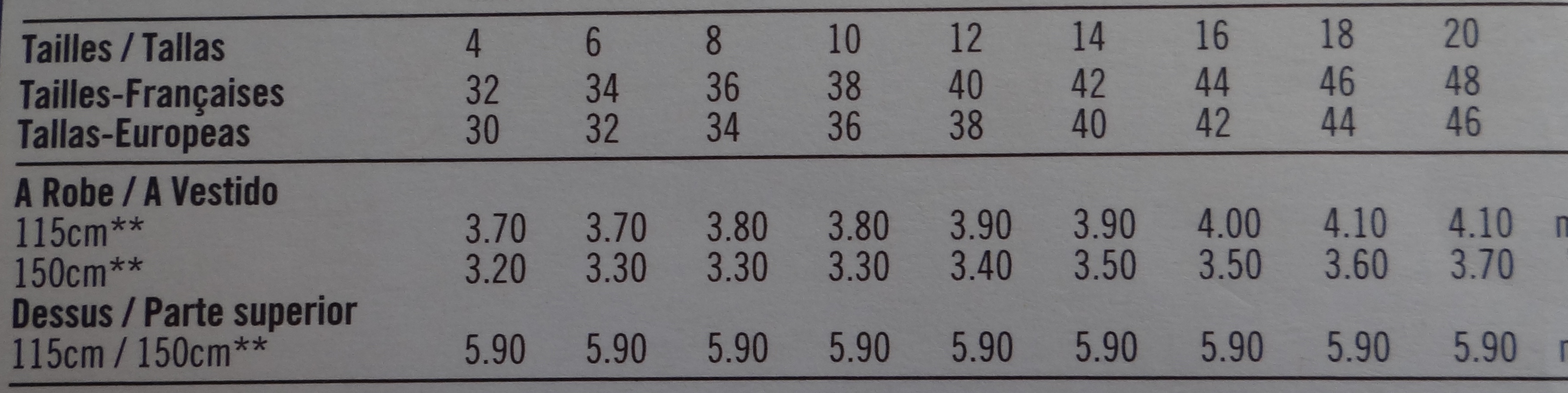 - Fabric charts: indicating how much fabric you need – check the whole chart as lining and interfacing requirements are likely to be stated in different areas. The first photo is the fabric measurements in metric (taken from the right hand side of the pattern envelope), the second photo gives measurements in imperial (from the left side) and the last indicates the amount of lining needed.