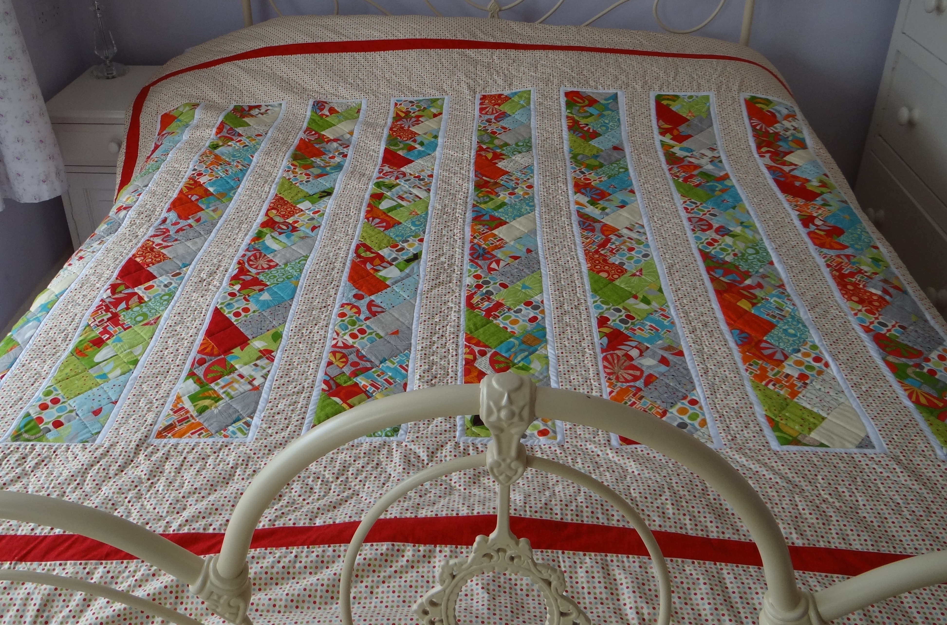 The start of the story was easy – each Jelly Roll was cut into trapezoids which were in turn sewn together to make a friendship braid. The design was based on a friendship braid from one of Pam and Nicky Lintott’s Jelly Roll books. The braids flew together so quickly – I totally loved Jenn Ski’s 50s and 60s Mod Century fabrics and their vibrant and zingy effect that couldn’t fail to warm you up even on the coldest winter day.