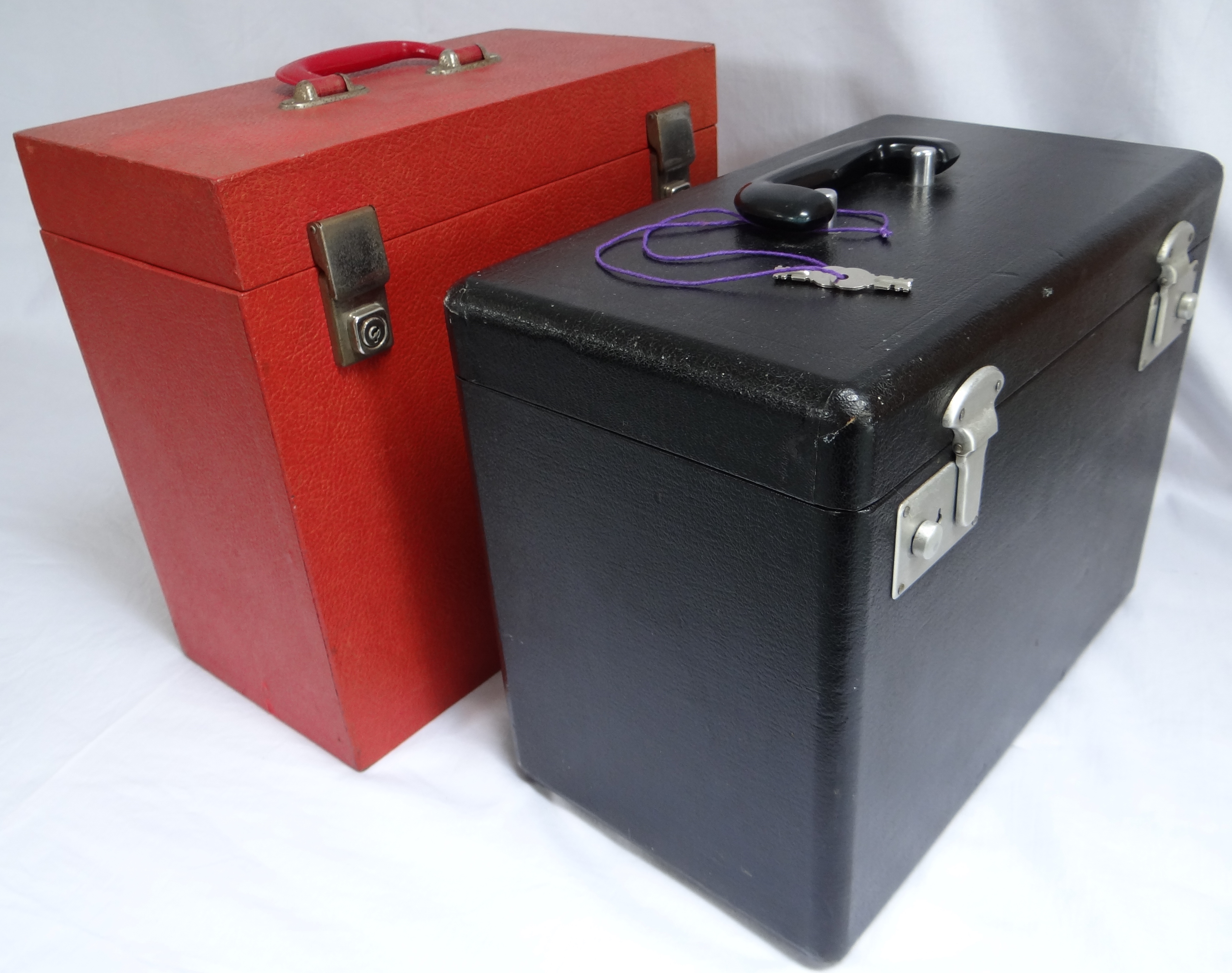 The black carry case of the 222K is on the right next to a red vintage LP vinyl case.