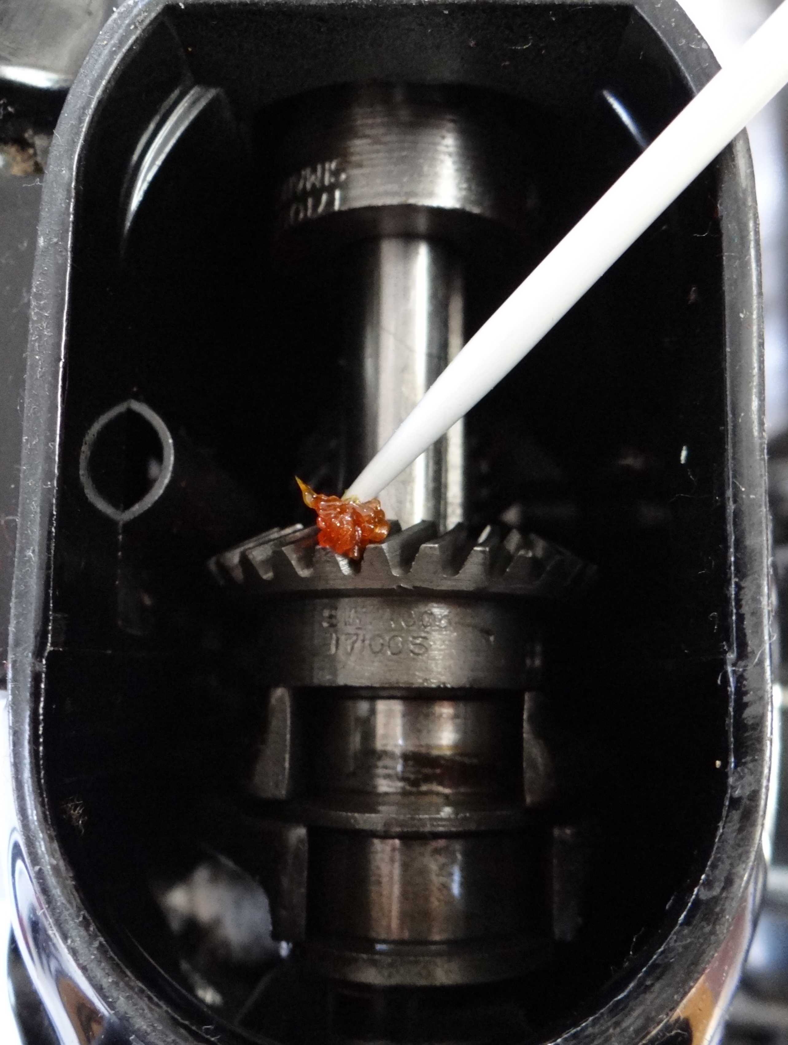 Under the top cover plate are some more oil holes and gears. To lubricate the gears I smear a little Singer lubrication for motors onto a couple of the teeth, then turn the hand wheel to spread the lubricant across the rest of the gears.