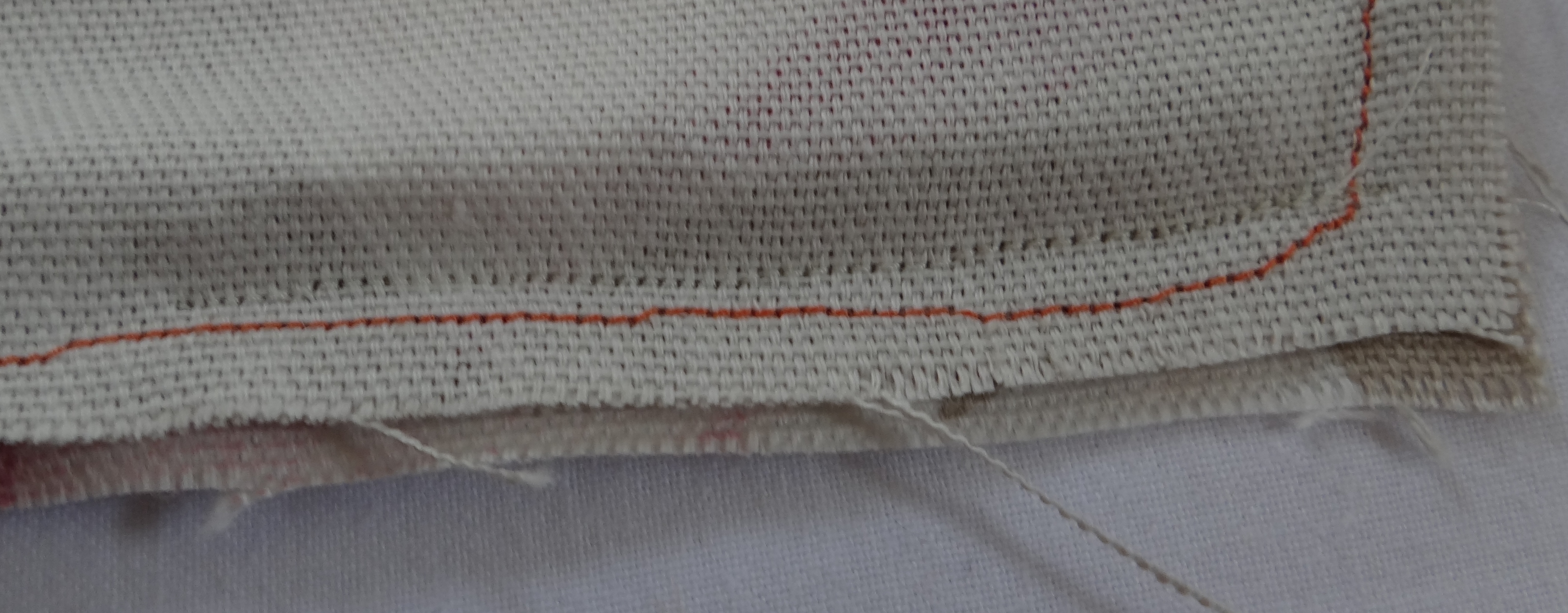 When the piping is sewn to the cushion panel use a bobbin thread colour that will show up on the wrong side of the fabric as it will make it easier to see where to sew when the cushion panels are joined together. I’ve used orange thread.