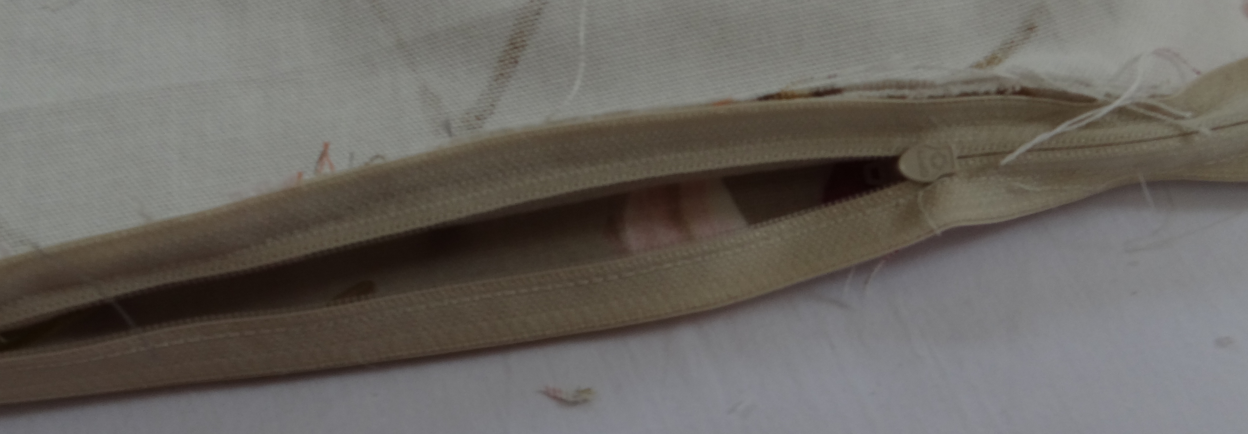 8.  If you want to make a small flap to help conceal the zip, on the right side of the panel sew a straight line next to the zipper teeth of the non-piped panel. The stitches will be seen when the cushion is finished so keep that stitching straight!