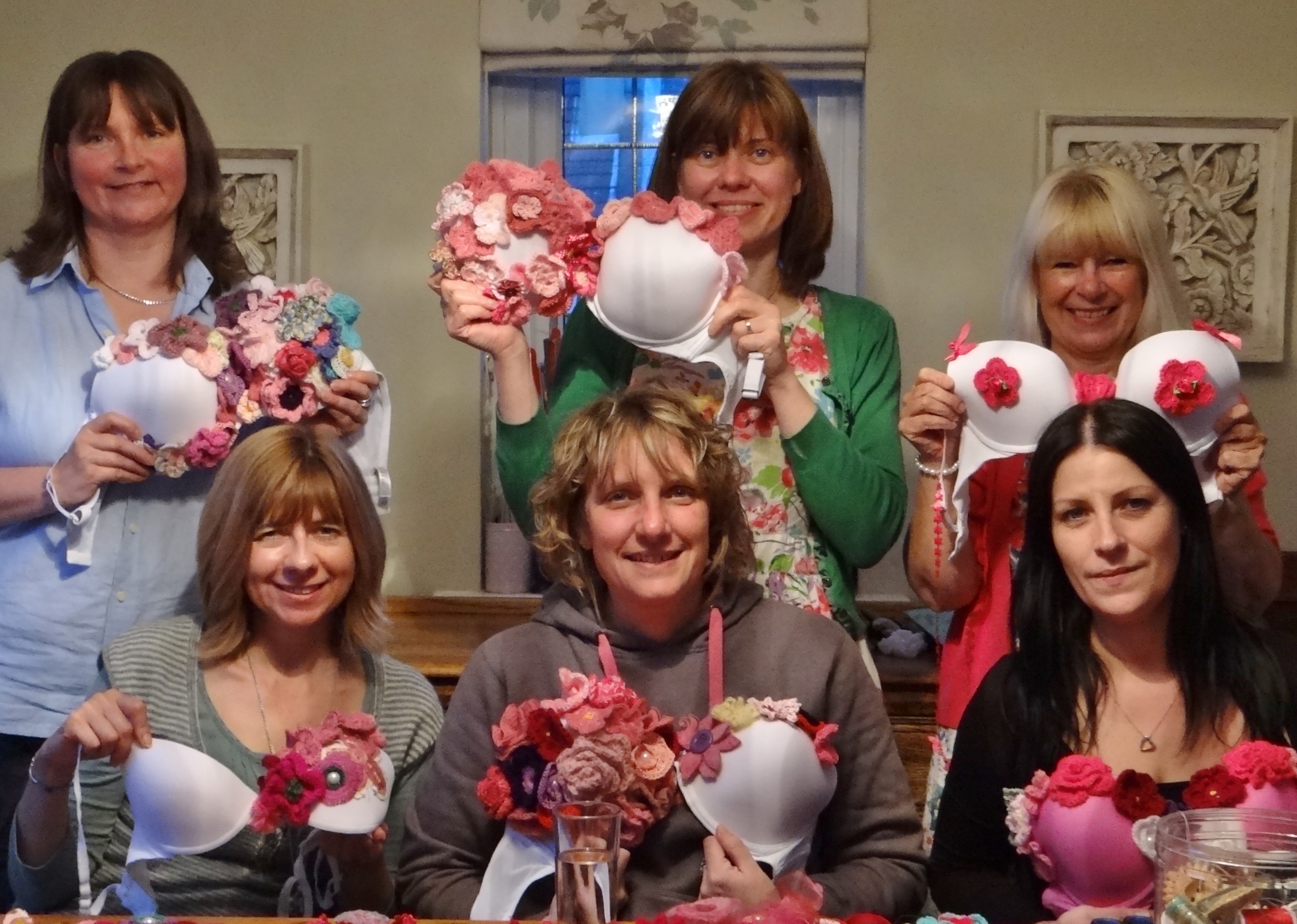Here are 6 of us MoonWalkers – half way through our flower power bra decorating!