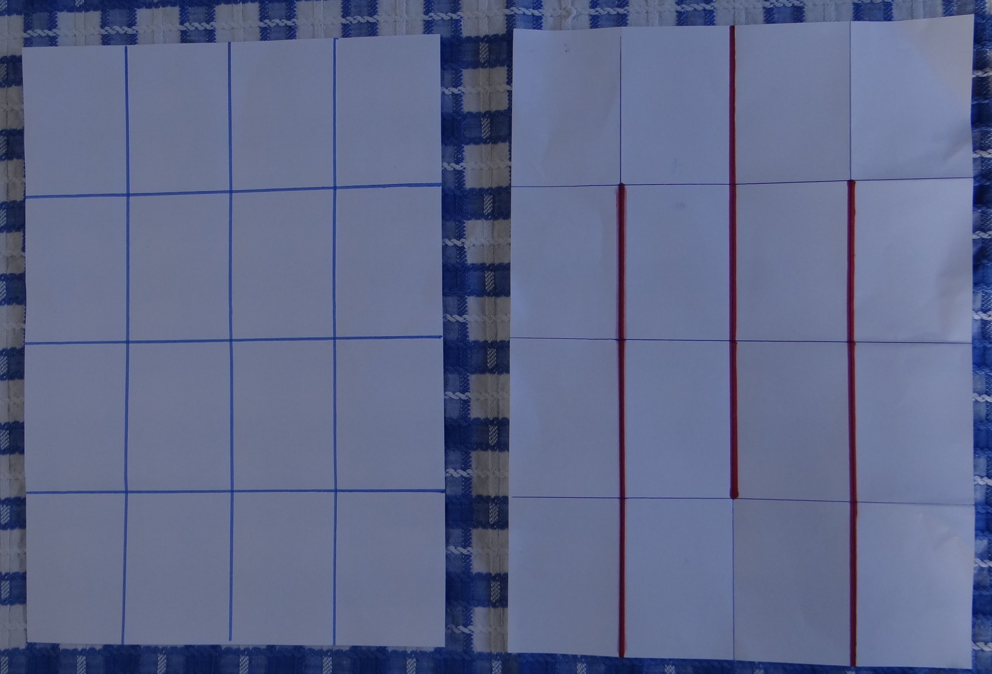 Your piece of paper should now be folded into a 4 x 4 grid of 16 rectangles – I’ve marked the fold line in blue in the picture below so you can see them a little clearer.