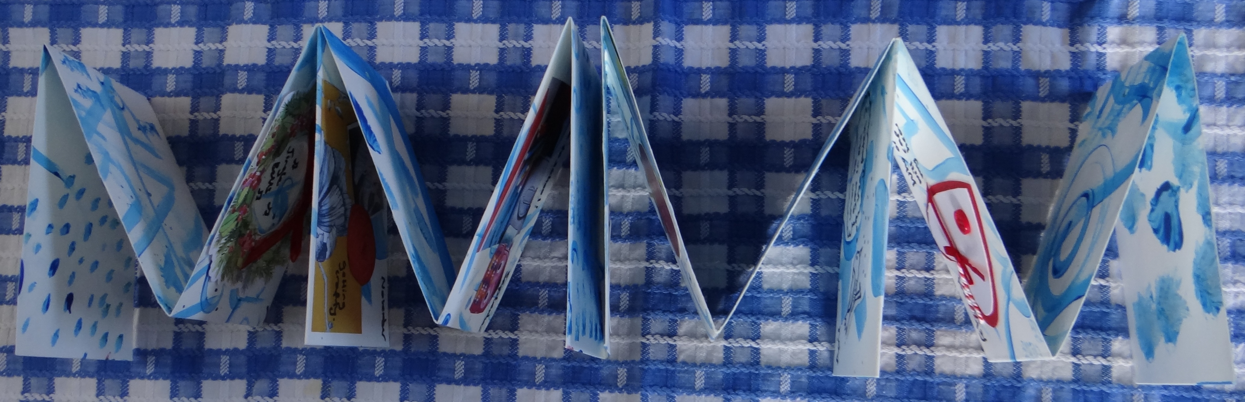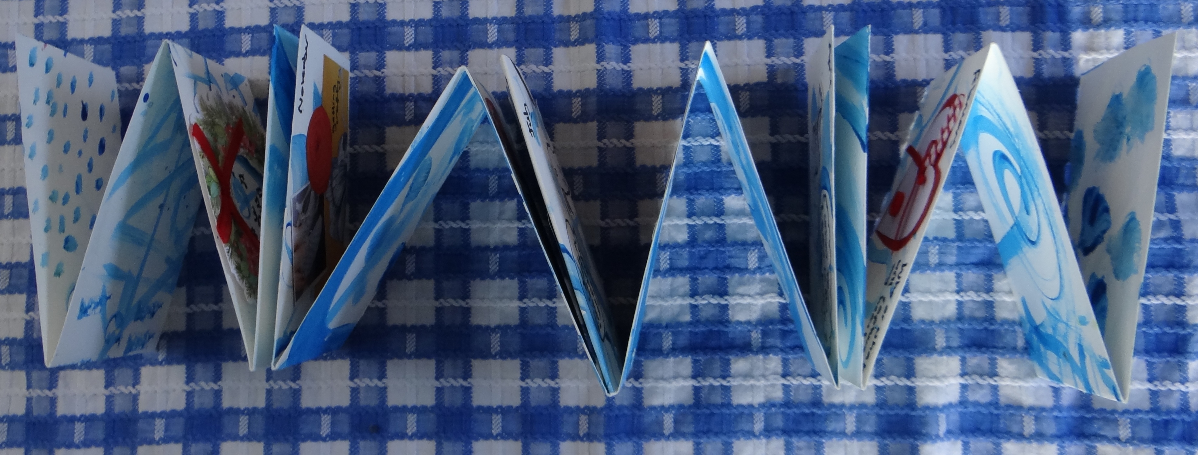 Hold your paper from one of its ends and fold the sections back and forth to concertina the book. When the pages are spread out you will have a mixture of single and double pages. The number of pages will depend on which way up you hold your book. Here’s a book from one way…