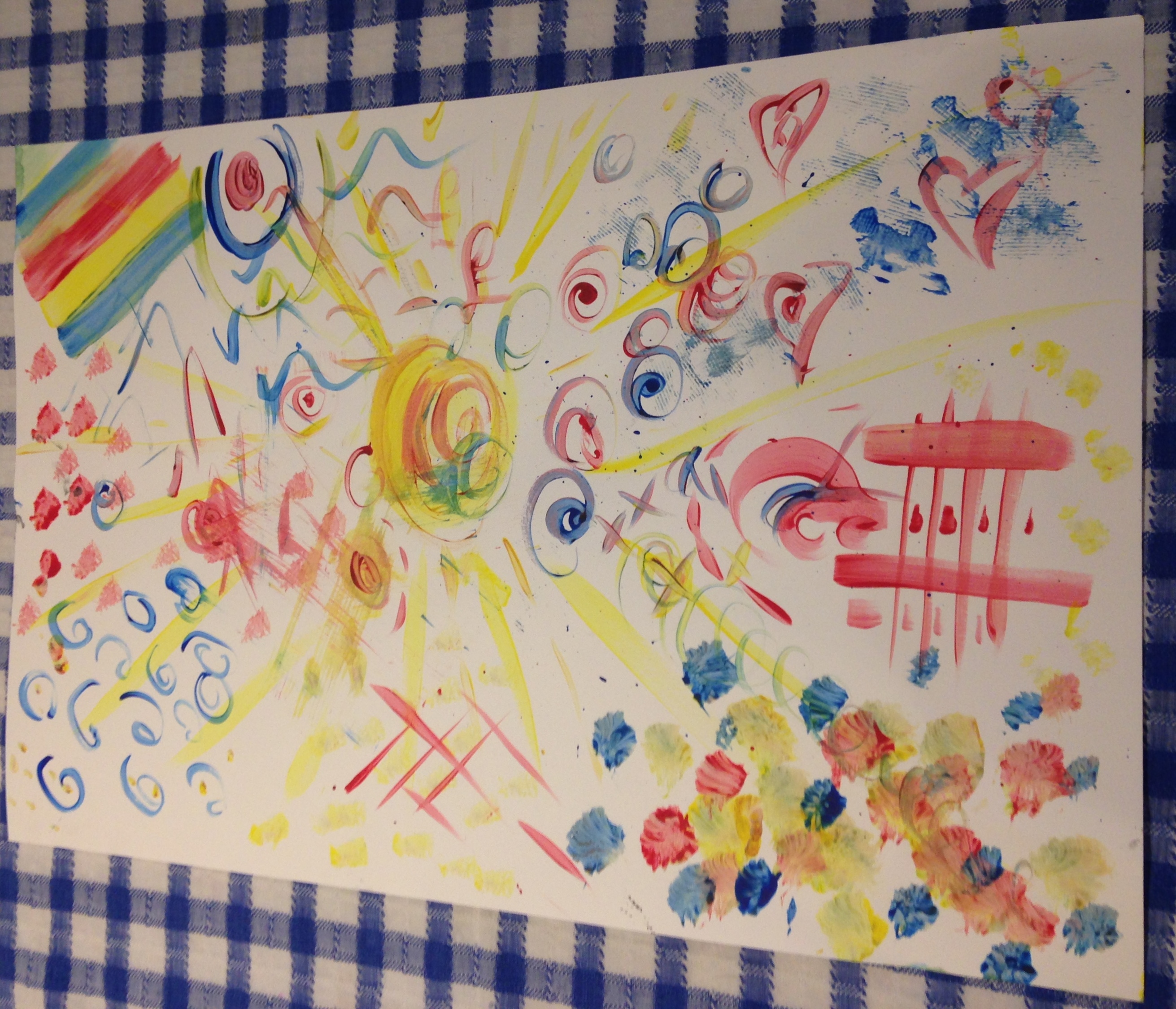 Take some thick watercolour paper (I’m using half an imperial sheet = 30 x 22 inches of 300g/m2 or 140lb weight) and decorate with an abstract design. Watercolours, poster paints and inks all work well. You are aiming to have variety of designs across the sheet rather than a uniform design. To inspire your strokes you may want to think of some words to focus on as you cover the page. For example: surprise, flow, reject, prickly, splodge, prance etc. Try out different brushes, sponges, stamps or even paint with feathers or penne pasta to produce different effects. The main thing is to have fun and ‘go-with-the-flow’.