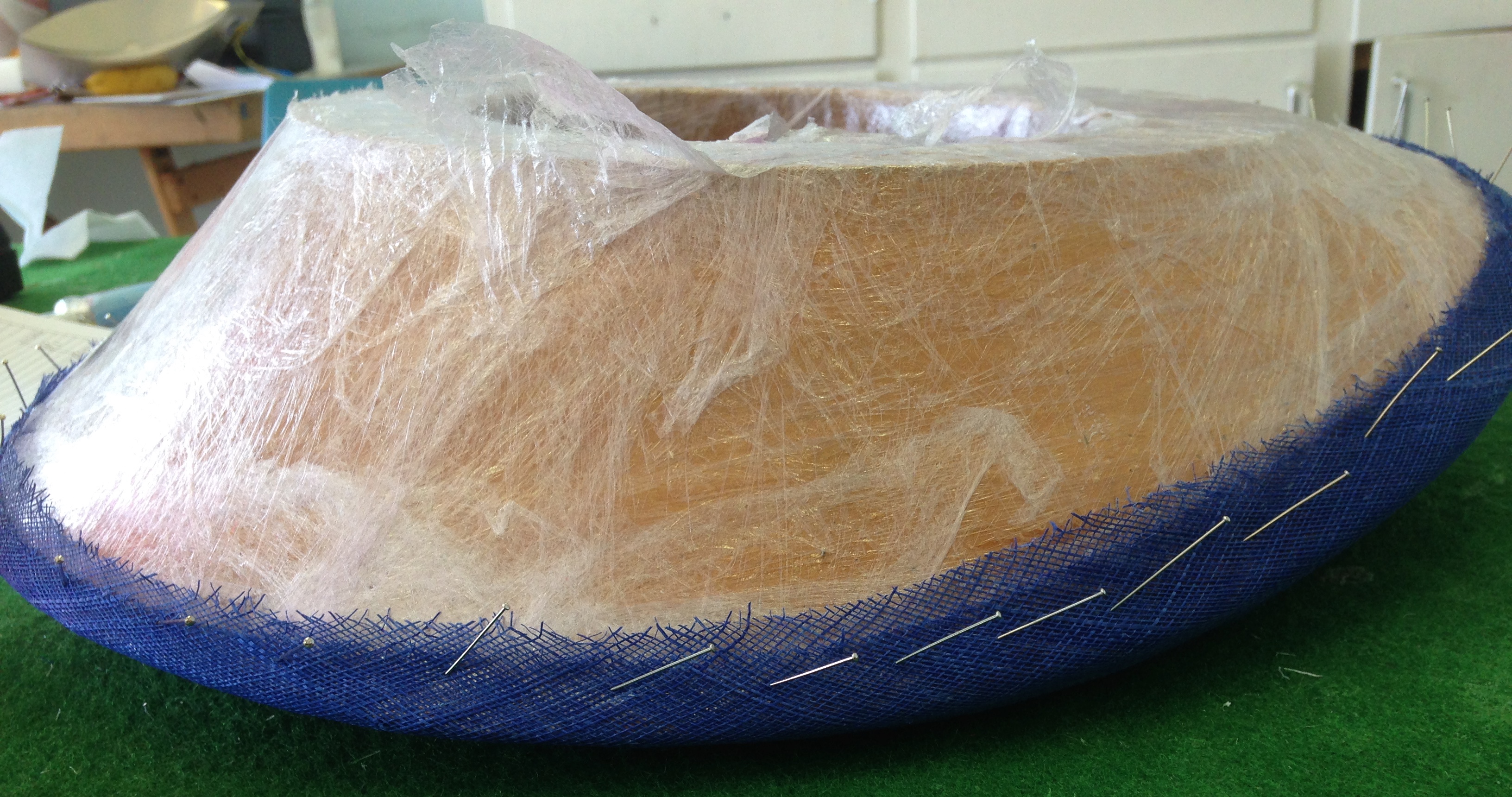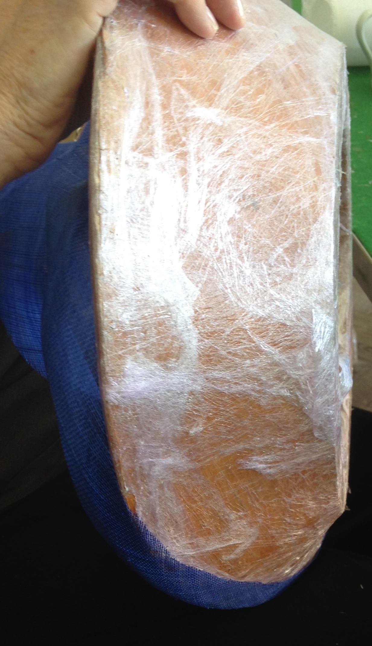 Step 1 – Cover your block in plastic then measure the widest part of your brim block and cut 2 Sinamay bias strips (mine are 7.5 inches) of that width.