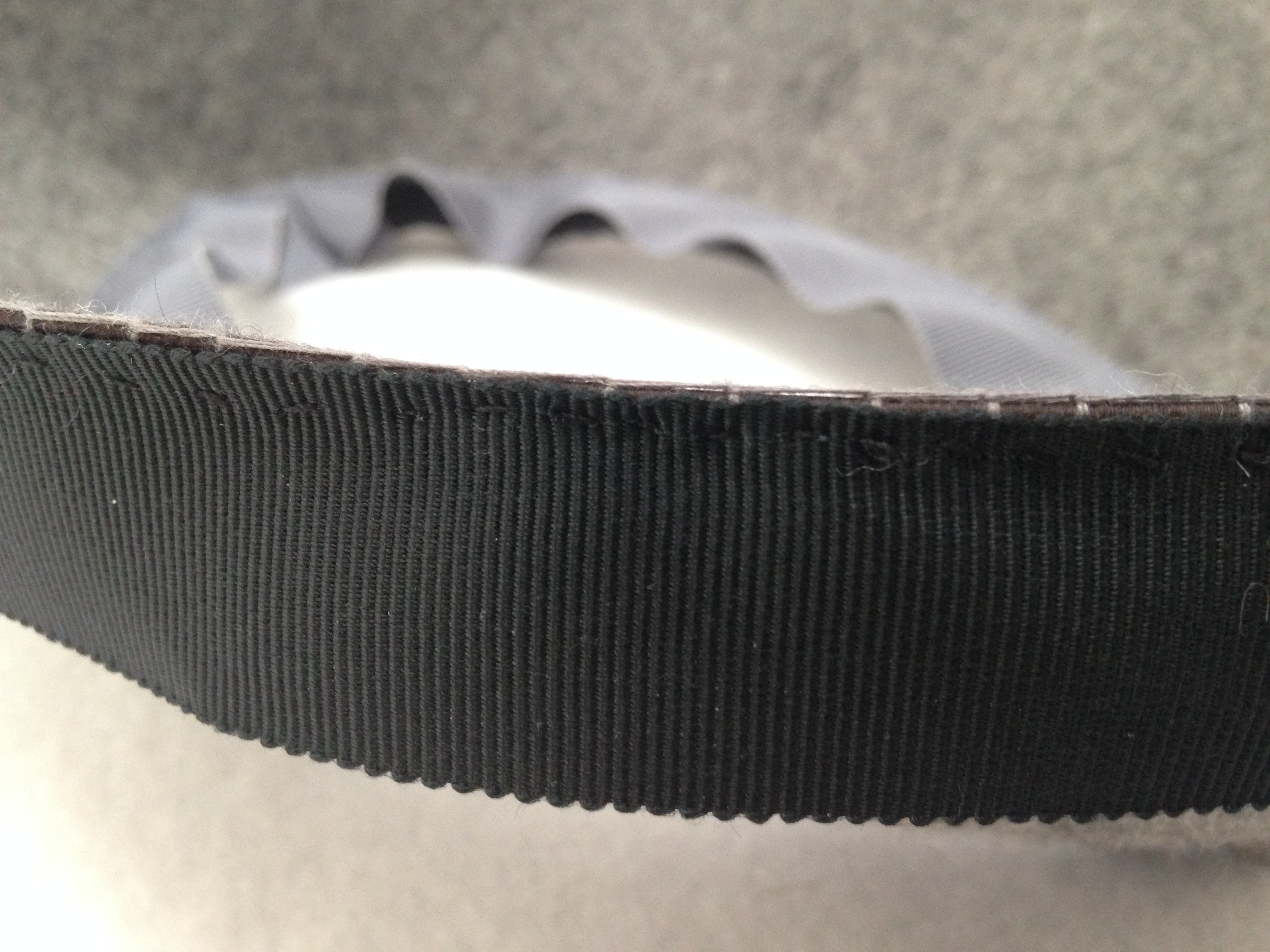 Step 10: Cover the edge of the wired brim with Petersham ribbon or other bias strip. I’ve used Petersham ribbon folded back on itself for a really neat finish. Remember to join the ends of the ribbon before you secure it to the brim – a straight seam for Petersham.
